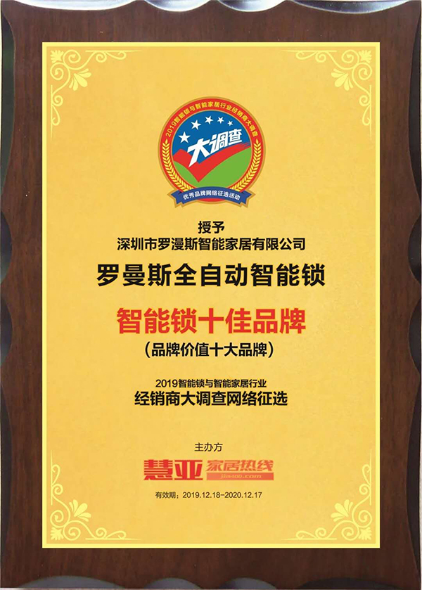 ? ? ? 近日,由慧亞家居熱線主辦的2019智能鎖與智能家居經(jīng)銷商大調(diào)查優(yōu)秀品牌網(wǎng)絡(luò)征選結(jié)果公布。羅曼斯在150個(gè)參選品牌中脫穎而出,榮獲智能鎖十大品牌(品牌價(jià)值十大品牌)獎(jiǎng)項(xiàng)。