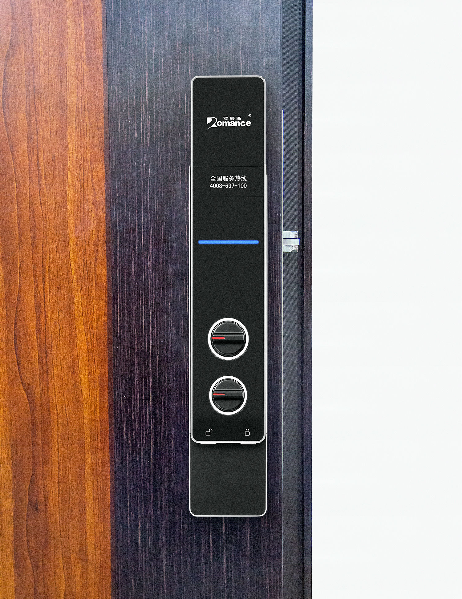 ? ? ? ? 后鎖板( )上分別有logo、 全國400 服務熱線、室內應急旋鈕、內保險旋鈕、一鍵開上 鎖。
